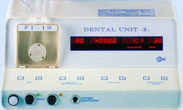 Dental Unit 2 Sehr einfach zu bedienende Multifunktionelle Implantat-Chirurgie Maschine mit 2 Motorsystemen Drehzahl 100 - 40.000 UPM Torque regelbar 0 - 500 Nmm Handstückvorwahl stufenlos von -100:1 bis 1:1 und von 1:1 bis +1:3